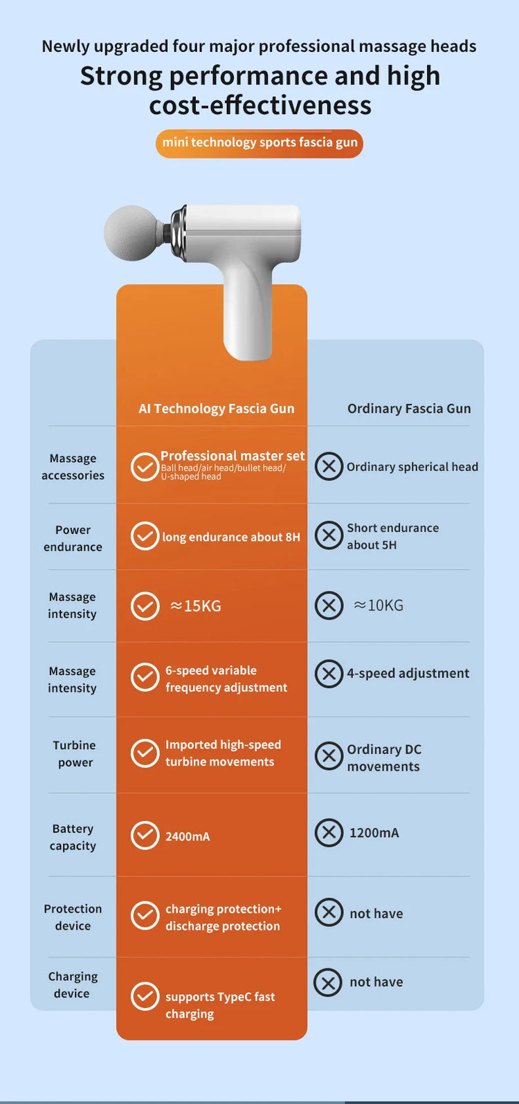 With its four upgraded professional massage heads, this fascia gun delivers powerful performance and excellent value for money. The AI technology behind it ensures a massage that stimulates and rejuvenates your muscles like never before. The massage heads included in the professional master kit, such as the ball-shaped head, air head, bullet head, and U-shaped head, cater to various muscle groups, allowing even beginners to perform professional massage techniques, including acupressure.