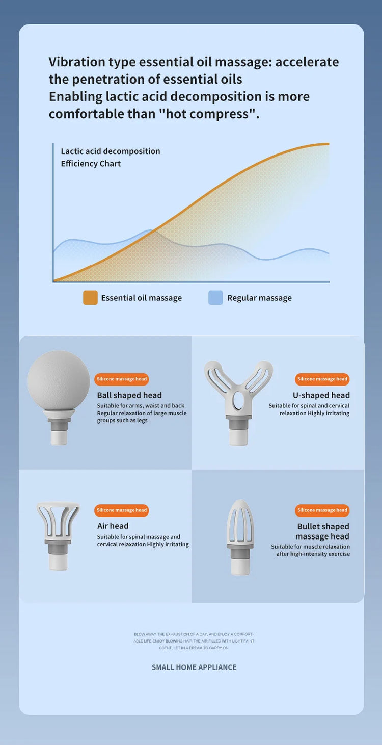 6. SPA-like Skin Care: Enhance your massage experience by using massage oils that work in synergy with the fascia gun's vibrations, providing soothing relief and nourishment to your skin. Accelerate the penetration of essential oils into the subcutaneous layer, promoting the breakdown of lactic acid for greater comfort. Additionally, it helps improve meridian flow and alleviate fatigue.